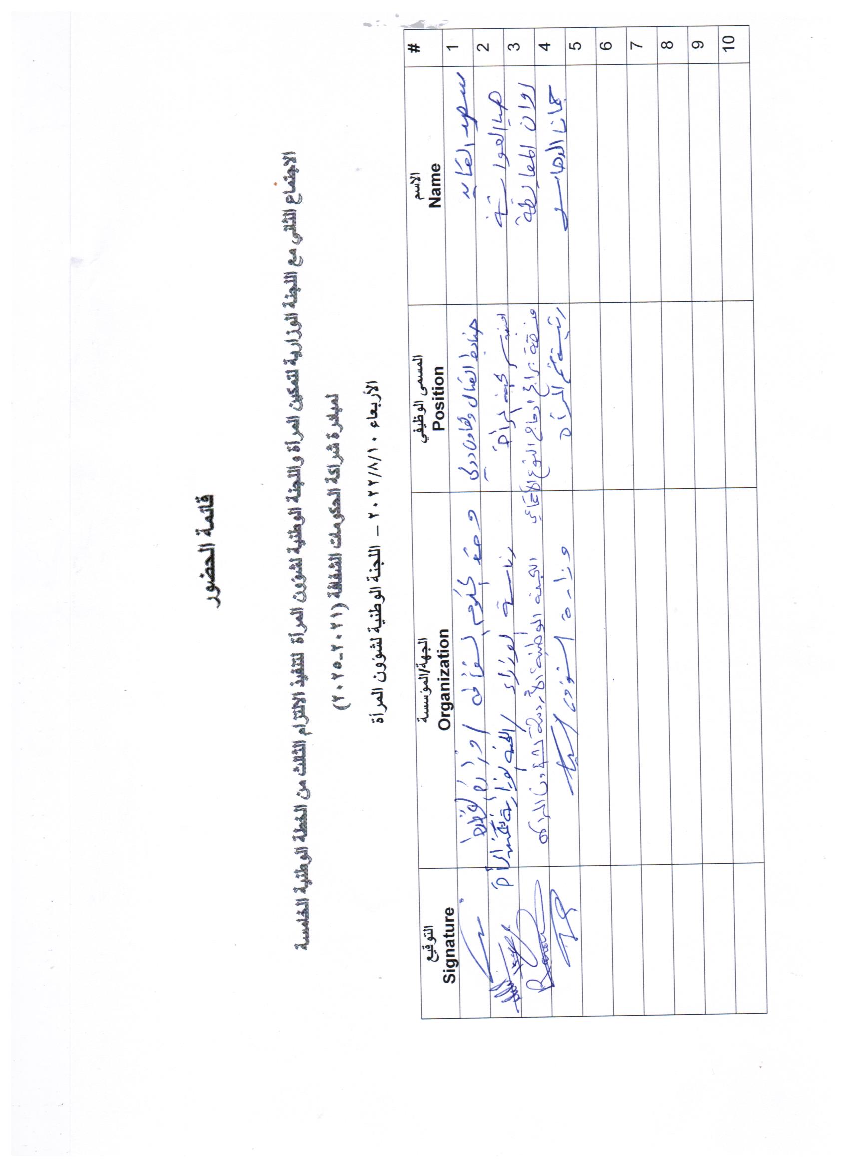 The Second meeting during the implementation phase of Commitment # 3 of the 5th OGP National Action Plan “Adoption of gender mainstreaming policies in the public sector” was conducted on 10/8/2022 at the Jordanian National Commission for Women (JNCW). The meeting was conducted face-to-face and was attended by the focal points of Inter-Ministerial Committee for Women’s Empowerment, the Jordanian National Commission for Women (JNCW),Ministry of Political and Parliamentary Affairsl, and Ministry of Planning and International Cooperation . The attendees discussed the executive plan, the time-line, and the resources required to implement the commitment. .In addition, the recommendations of the civil socitey organizations related to the implementation of commitment' milestones and the OGP guiding principles and standards were also discussed during the meeting [1] [2]
