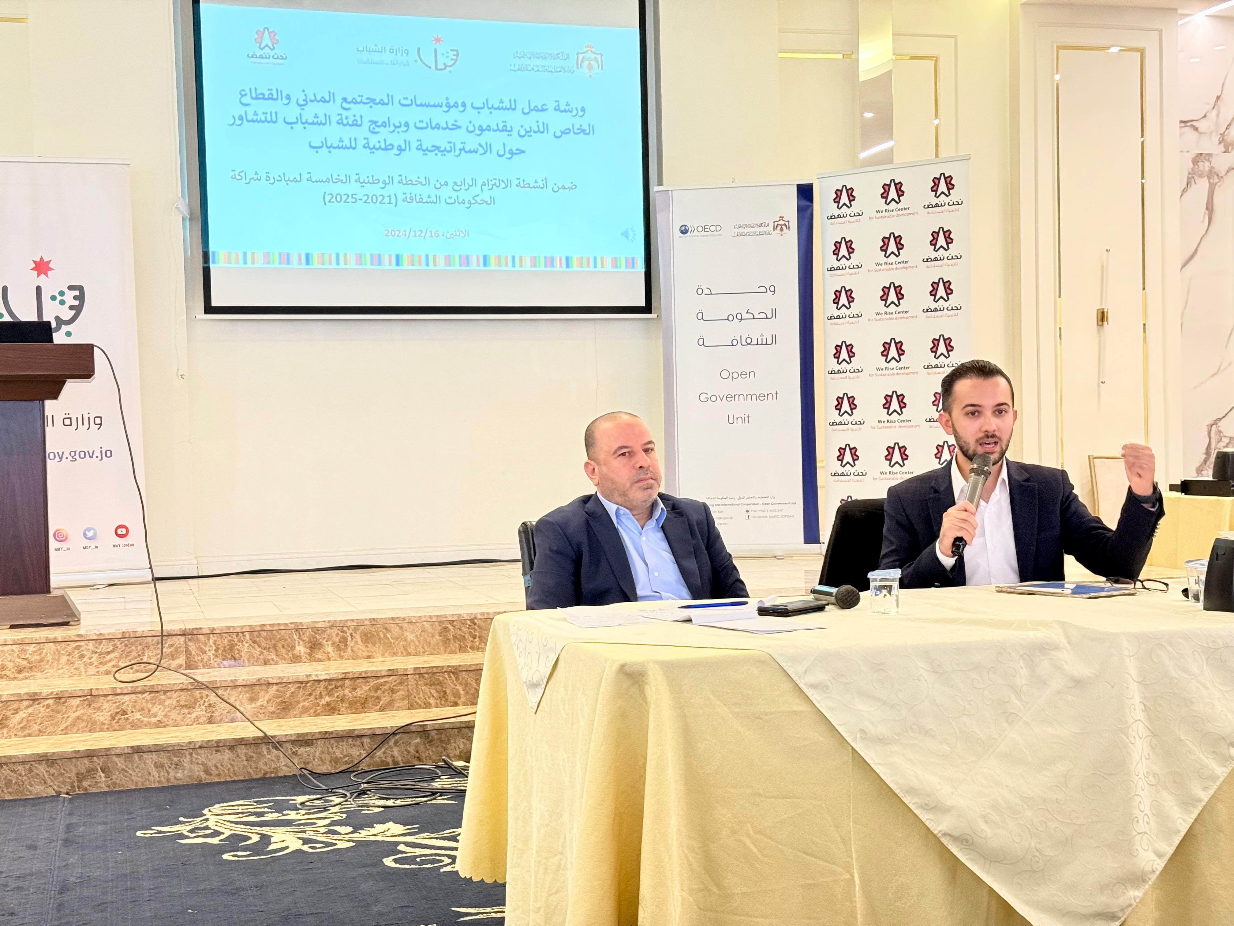 عقدت وزارة الشباب بالشراكة مع وزارة التخطيط والتعاون الدولي وبالتعاون مع منظمة "نحن ننهض"،{في محافظة اربد ورشة عمل مع شباب ومؤسسات المجتمع المدني والقطاع الخاص الذي يقدمون خدمات ويرامج لفئة الشباب للتشاور حول الإستراتيجية الوطنية للشباب (2019-2025).، وذلك يوم الاثنين 2024/12/16