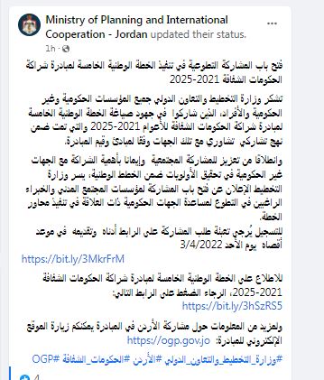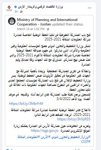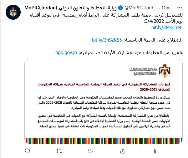 تعلن وزارة التخطيط والتعاون الدولي اليوم الثلاثاء 2022/3/15 عن فتح باب المشاركة التطوعية لمؤسسات المجتمع المدني والخبراء الراغبين في التطوع لمساعدة الجهات الحكومية ذات العلاقة في تنفيذ محاورالتزامات الخطة الوطنية الخامسة لمبادرة شراكة الحكومات الشفافة 2021-2025، وذلك انطلاقا من تعزيز للمشاركة المجتمعية وإيمانا بأهمية الشراكة مع الجهات غير الحكومية في تحقيق الأولويات ضمن الخطط الوطنية [1] [2] [3] [4] [5] [6] [7]