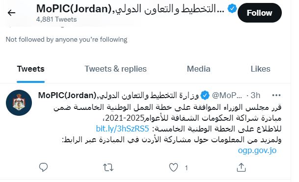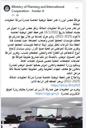 في إطار مبادرة شراكة الحكومات الشفافة، وافق مجلس الوزراء الموقر في جلسته المنعقدة بتاريخ 16/1/2022 على خطة العمل الوطنية الخامسة للأعوام (2025-2021)، والتي جرى إعدادها من خلال نهج تشاركي مع مختلف مؤسسات المجتمع المدني وأصحاب المصلحة، حيث تضمنت هذه الخطة ستة التزامات تتعلق بتوفير البيئة الداعمة لمؤسسات المجتمع المدني، وتعزيز مشاركة المواطنين في عملية صنع القرار، وتبني سياسات لإدماج النوع الاجتماعي في القطاع العام والتمكين المجتمعي للشباب، وتعزيز النزاهة على المستوى الوطني، بالإضافة إلى تنفيذ مشاريع حكومية متوافقة مع احتياجات المجتمعات المحلية لتحسين مستوى الخدمات العامة.